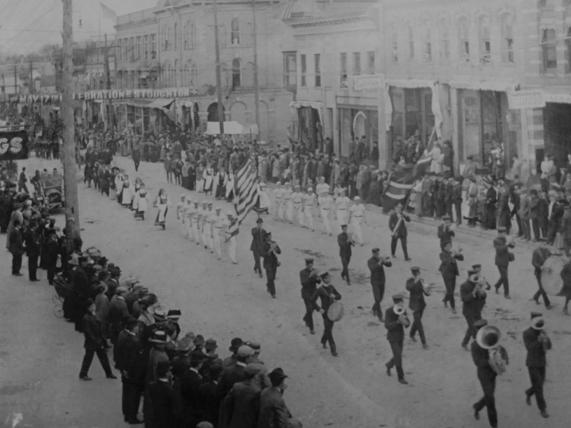 Bildet viser feiring av 17. mai 1910 i småbyen Stoughton i Wisconsin.